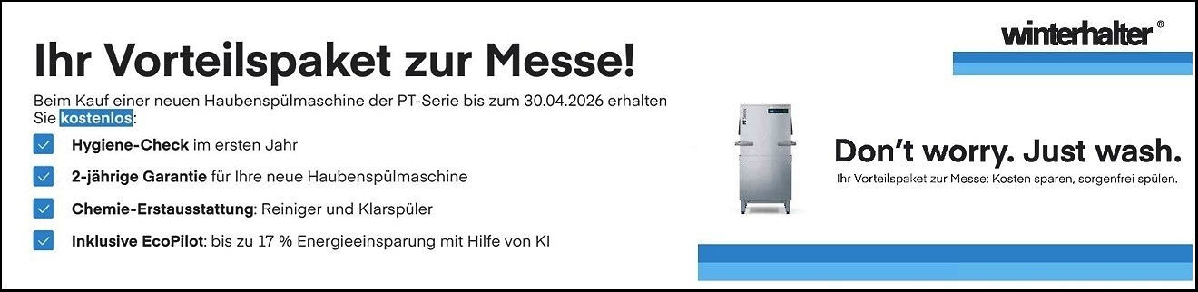 Winterhalter Spülmaschinen: Korbdurchschub Spülmaschine PT-XL - schnell brilliante Spülergebnisse durch Profi-Durchschubspülmaschinen von Winterhalter Die Korbdurchschub-Spülmaschinen der PT-Serie sind als Gläser-, Geschirr-, Bistro- oder Besteckspülmaschinen und je nach Platzverhältnissen, Kapazität und Spülgut in den Größen M, L und XL erhältlich. Sie können sich auf eine Spülmaschine verlassen, die optimal auf Ihre individuellen Anforderungen abgestimmt ist. Perfekte Spülergebnisse sind garantiert. Mit zusätzlichen Ausstattungsoptionen können Sie die Maschine noch weiter individualisieren. Die PT-Serie – eine wirtschaftliche Lösung für brillante Spülergebnisse.Fragen Sie nach unserem Hauspreis! Auf Anfrage unterbreiten wir Ihnen gerne ein persönliches Angebot! PT-XL EnergyPlus Zulaufwassertemperatur < 20 °C • Wärmerückgewinnung EnergyPlus:Kombination aus Abwasser- und Abluftwärmerückgewinnung Serienausstattung für alle Modelle der PT-Serie • Spülsystem VarioPower: S-förmige Spülfelder mit maximaler Flächendeckung und optimierter Düsengeometrie für höchste Reinigungskraft bei variabler Druckanpassung• Spülfelder werkzeuglos und leicht zu entnehmen• Vierfach-Filtration (Flächensieb, Siebzylinder, Siebunterteil, Mediamat)• Smartes Touch-Display• Wärmerückgewinnung EnergyLight*1 (Abwasserwärmerückgewinnung)• Tiefgezogener Hygiene-Tank• Hygiene-Tankheizkörper• EasyAccess über QR-Code• CONNECTED WASH – vernetzte Spülmaschine zum Überwachen von Betriebsdaten• Fortschrittsanzeige im Display• WLAN-Funktion eingebaut• USB-Schnittstelle für Softwareupdates• Eingebautes Klarspülerdosiergerät• Reinigersensor• Geführtes Selbstreinigungsprogramm• ECO-, Kurz-, Silence-, Einweich- und Intensivprogramm• Grundreinigungsprogramm für Spülgut• Starttaste mit Farbcodierung und Statusanzeige• Drei Standardprogramme (Besteckspülmaschinen ein Standardprogramm)• Entkalkungsprogramm für Maschine• Zeitgesteuertes Ein- und Ausschalten• Getrennte Leerstandsanzeige für Reiniger / Klarspüler• Energiesparhinweis bei offener Haube• Detaillierte Fehleranzeige mit Fehlercode und Text• Wartungsintervallanzeige• PIN-geschützte Küchenchef-Ebene und PIN-geschützte Servicetechniker-Ebene• Temperaturanzeige (Boiler und Tank)• Integriertes Hygiene-Tagebuch und Anzeige von Betriebsdaten• Videounterstützte Handlungsempfehlungen• Speicherung der Kontaktdaten von Servicetechniker und Chemielieferant• Doppelwandige Haube mit Rastposition• Automatischer Haubenstart• Erfüllt die Hygiene-Anforderungen der gültigen Normen• Sanftanlauf• Thermostopp für Hygiene-Sicherheit• Ablaufpumpe• Nachspülpumpe• Druckunabhängiger Boiler• Leckagesensor• Multiphasing• Multifunktionsschnittstelle für externe Dosiergeräte• Edelstahlrückwand• Aktives Energiemanagement• Tankwasserwechselprogramm• Zulauf- und Ablaufschläuche, Anschlusskabel• Ein Korbpaket nach Wahl Spülergebnis/Geschwindigkeit* Elliptische Spülfelder mit spezieller Düsengeometrie* Spüldruckanpassung VarioPower* Vollstrom-Filtration: Tankabdeckung, Siebzylinder, Pumpenansaugsieb mit Sicherheitsabfrage, Mediamat* Trübungssensor* Klarspülerdosiergerät eingebaut* Aktives Energie-Management Wirtschaftlichkeit* Wärmerückgewinnung EnergyLight*1 (Abwasserwärmerückgewinnung)* Sonderprogramm ECO Bedienfreundlichkeit und Ergonomie TouchscreenFarbcodierte Ein-Knopf-Bedienung mit FortschrittsanzeigeKurz- und IntensivprogrammeGrundreinigungsprogramm für SpülgutSonderprogramm SilenceGeführtes SelbstreinigungsprogrammEntkalkungsprogramm für MaschineZeitgesteuerte In- und AußerbetriebnahmeautomatikAkustische Event-SignalisierungGetrennte Leerstandsanzeige für Reiniger/KlarspülerFehleranzeige Spülfelder blockiertWartungsintervallanzeigePIN-geschützte Küchenchef-EbenePIN-geschützte Servicetechniker-EbeneIntegrierte Hygiene- sowie BetriebstagebücherAnimierte Betriebsanleitung und SpültippsSpeicherung Kontaktdaten Servicetechniker und ChemielieferantDoppelwandige Haube mit RastpositionAutomatischer HaubenstartTiefgezogener Hygiene-TankHygiene-TankheizkörperHygiene-Korbträger Sonstiges Sanftanlauf SpülpumpeThermostopp für Hygiene-SicherheitAblaufpumpeDrucksteigerungspumpeLeckagesensorMultiphasingÜbergabeleiste für externe DosiergeräteMultifunktionsausgang als Schnittstelle zu externen GerätenCN-RückwandEZEO (Anschlussklemme für Energieoptimierung mit einfachem Lastabwurf) Optionale Ausstattung Spülergebnis/GeschwindigkeitEingebautes ReinigerdosiergerätEingebauter EnthärterWirtschaftlichkeitNEU: Wärmepumpe ClimatePlusWärmerückgewinnung EnergyPIus (Kombination aus Abwasser- und Abluftwärmerückgewinnung)Patentiertes angetriebenes NachspülsystemSchnittstelle nach DIN 18875 (Schnittstelle für Anschluss an Energiemanagementsysteme)DoppelkorbsystemBedienfreundlichkeit und ErgonomieFehleranzeige Salzmangel (bei eingebautem Enthärter)Automatische Haubenöffnung (PT-M, PT-L)SonstigesDurchschubspülmaschinen der PT-Serie garantieren dank innovativer Features in kürzester Zeit glänzende Spülergebnisse. Gleichzeitig sorgen die Maschinen für höchste Wirtschaftlichkeit in der Spülküche.Je nach Spülgut und Platzverhältnissen kann zwischen den drei Maschinenmodellen PT-M, PT-L und PT-XL gewählt werden.Die Maschinen der PT-Serie sind individuell konfigurierbar. Sie können zwischen speziell abgestimmten Spülprogrammen für Geschirr, Bistrospülgut, Gläser oder Besteck wählen. Dank weiterer Ausstattungsoptionen kann die Maschine optimal auf Ihre individuellen Anforderungen angepasst werden.Das innovative Maschinenkonzept der PT-Serie garantiert Ihnen Top Performance für perfekte Spülergebnisse - brillant, schnell und sparsam. TwinSet (Verbindung von 2 PT-Maschinen)*2Cool-Version (Kaltwassernachspülung für Gläser)HighTemp-VersionNiedrigtemperatur-Spülsystem effect3. DosiergerätDatenschnittstellen RS 232/R
