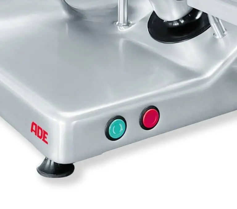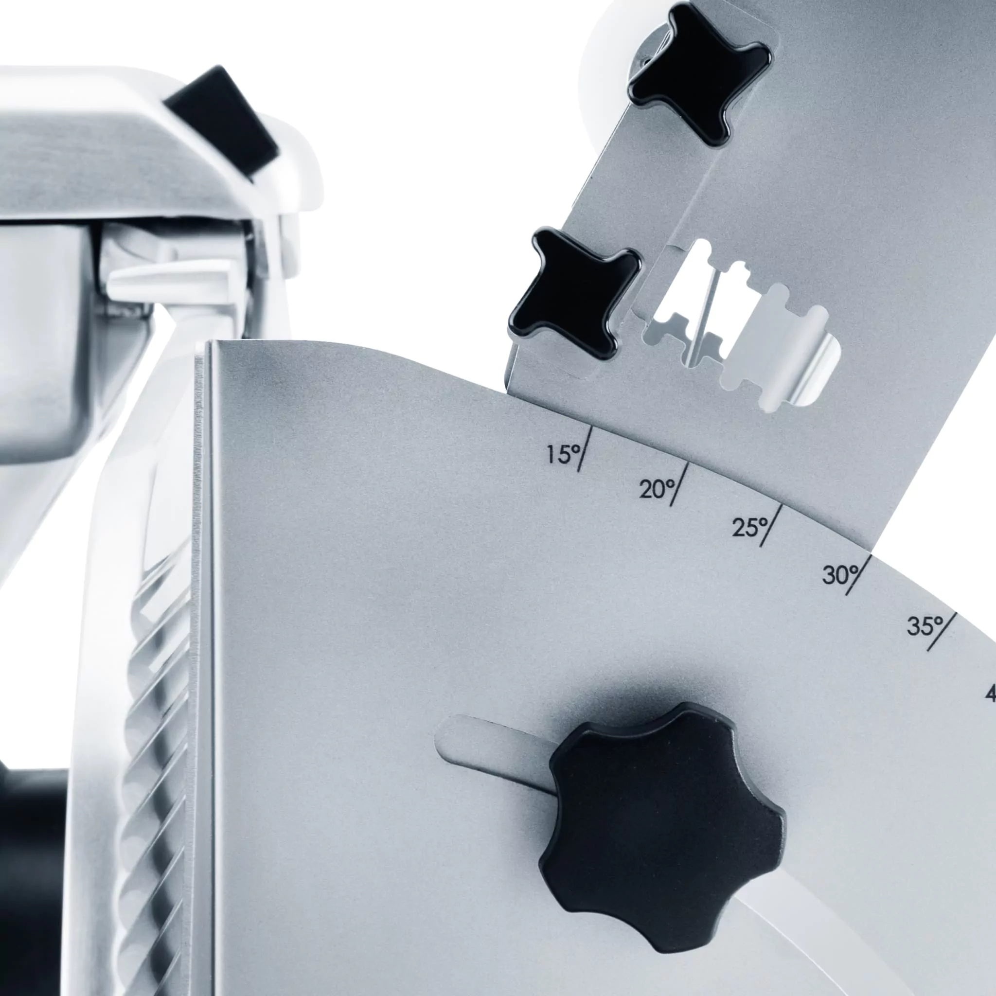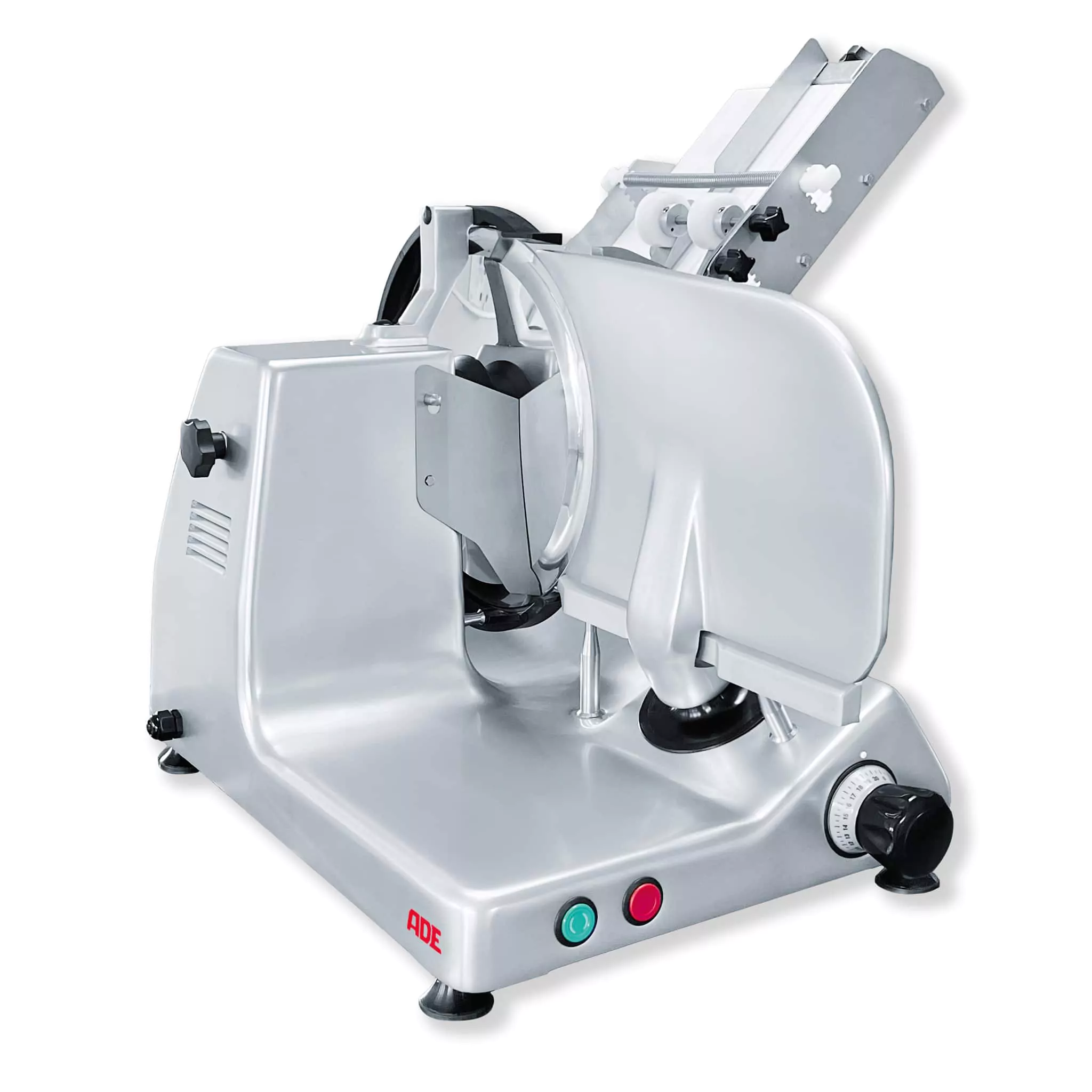 Spezielle Fischschneidemaschine, ideal zum Schneiden von Lachsseiten und Fischfilets, Das Modell Mare 350 von ADE schneidet problemlos in feine und gleichmäßige Scheiben. Seine leichtgängige Schnittgutzuführung ist mit einer Neigung von 15° bis 45° für unterschiedlich große Scheiben einstellbar. Spezielle Rippen für Antihaft-Effekt und Leitschiene sorgen für sicher gleitendes Schnittgut. Die Schlittenoberfläche ist aus lebensmittelgeeignetem Kunststoff, die Schnittstärke stufenlos einstellbare von 0 – 20 mm. Außerdem wird hier das Besser-Messer eingesetzt: Unser Multifunktionsmesser der neuesten Generation mit 2-Ebenen-Profil und hartverchromte Oberflächen-Veredelung sorgt für verbesserten Antihaft-Effekt und Aroma-Schutz.