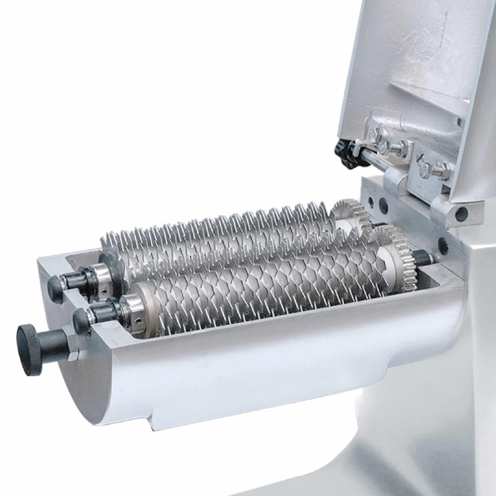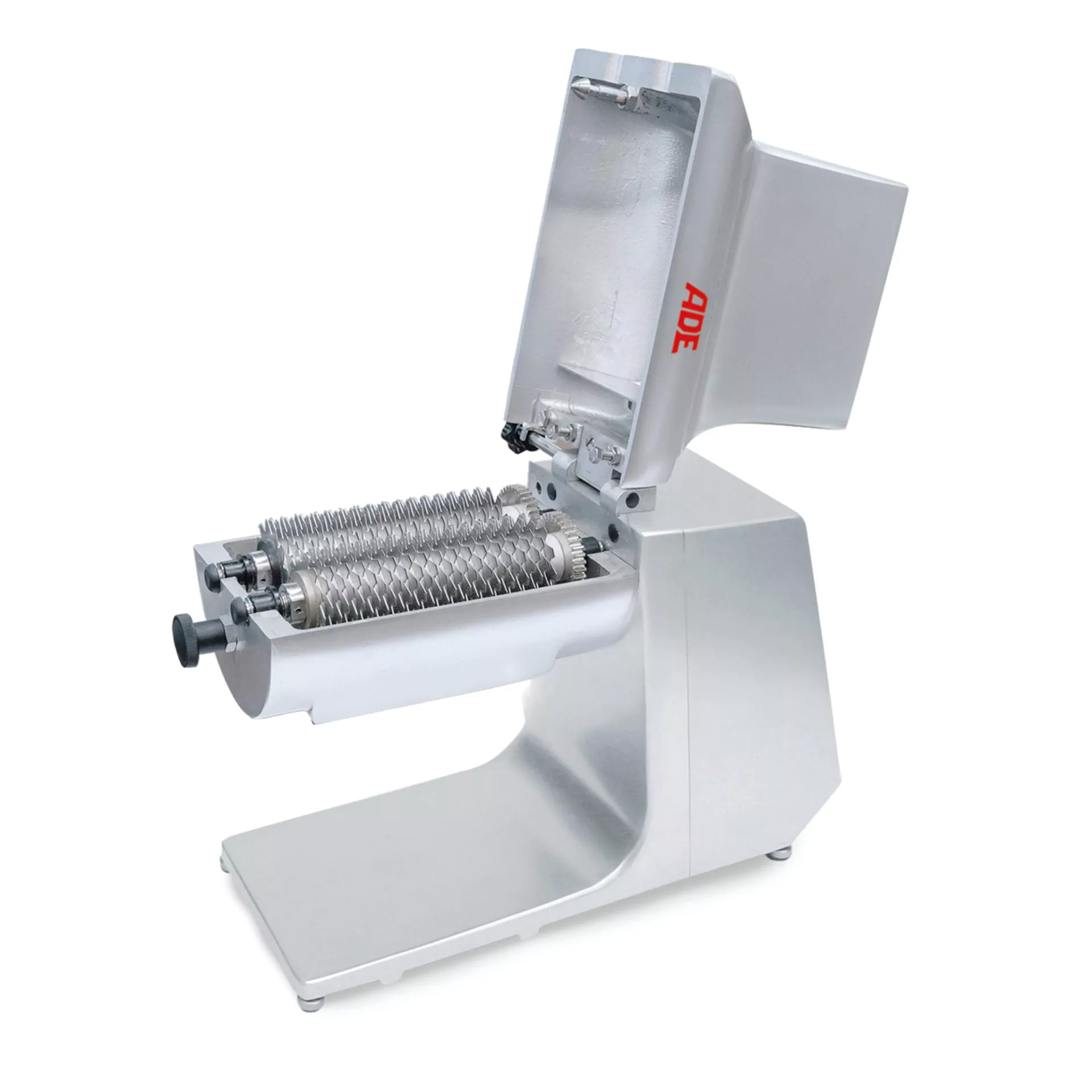 Der Fleischmürber ist mit zwei Mürbewalzen mit Edelstahl-Klingen ausgestattet. Mit diesen mürbt er Fleischstücke von bis zu 150 x 20 mm und sorgt für eine gleichmäßige Lockerung des Fleischgewebes. Das Basisgerät besteht aus einem robusten Gehäuse aus eloxiertem Aluminium. Eine einfache Bedienung und Reinigung sowie die mitgelieferte Stielbürste machen den Mürbeprozess so einfach wie noch nie. Ein einfacher Umbau ermöglicht es, dieses Modell auch als Streifenschneider zu nutzen.