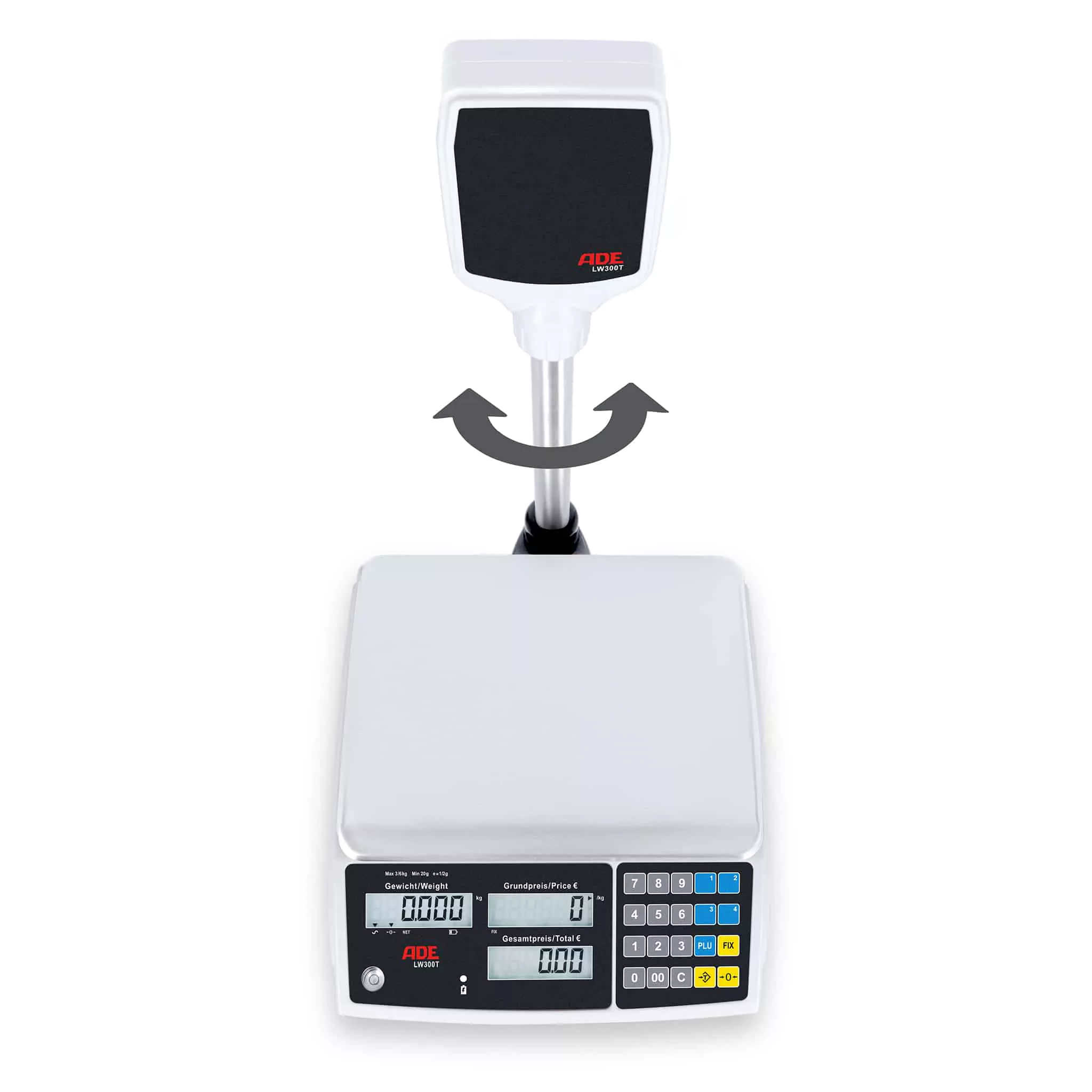 Dank drehbarer Hochanzeige ist die preisrechnende Ladenwaage perfekt für den Verkaufsbereich mit kompakten Abmessungen. Die Waage überzeugt mit vielen Funktionen: 4 Schnellspeichertasten, 9 PLU-programmierbare Preisspeicher und abnehmbare Edelstahl-Wiegefläche. Die Folientastatur ist abwischbar und entspricht höchsten Hygiene-Standards.