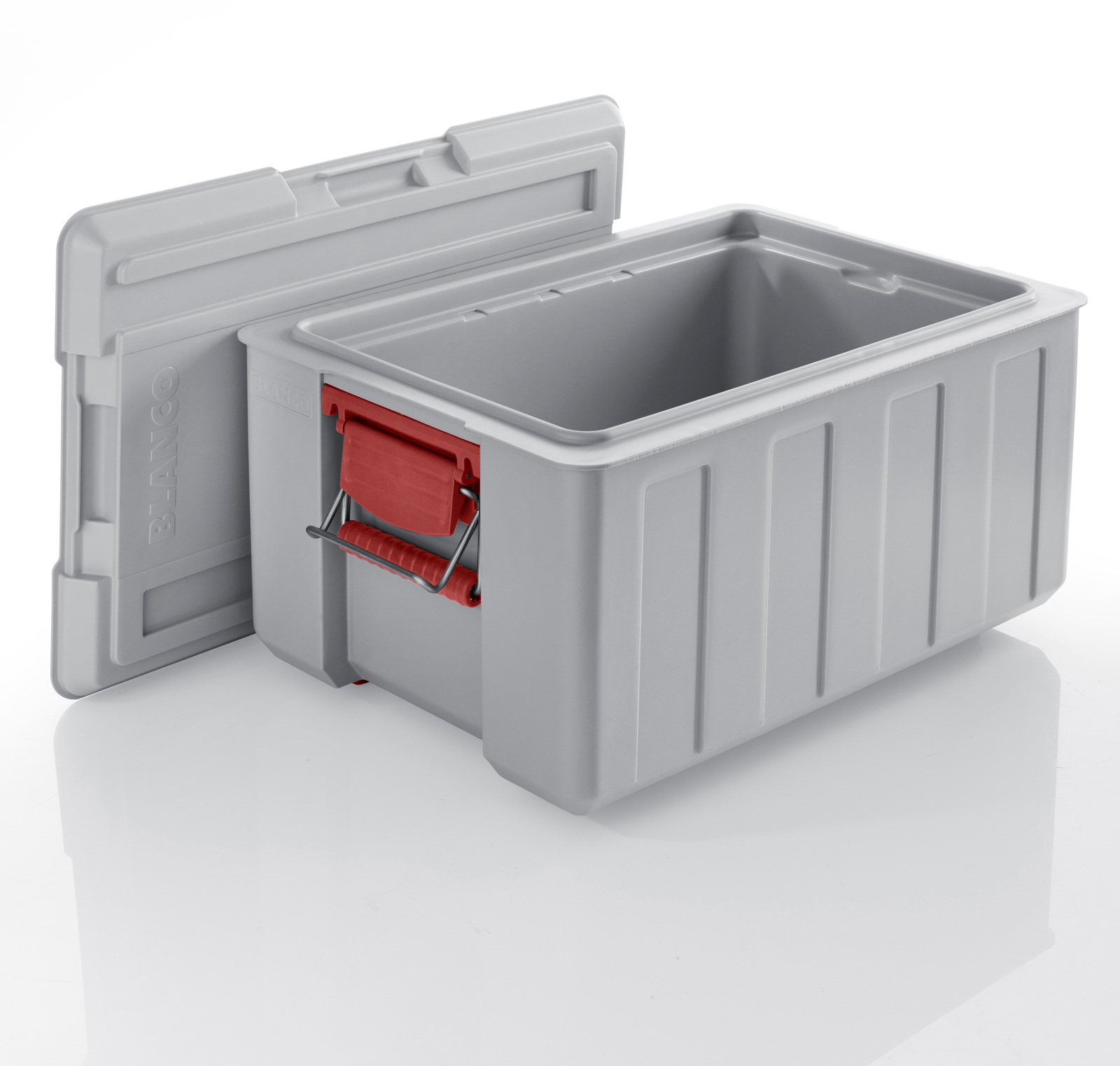 Verschluss durch stirnseitig im Behälter liegende Edelstahl-Spannverschlüsse, die im Deckel einrasten
