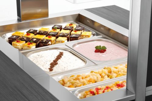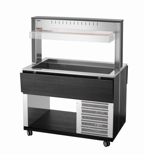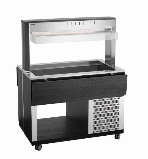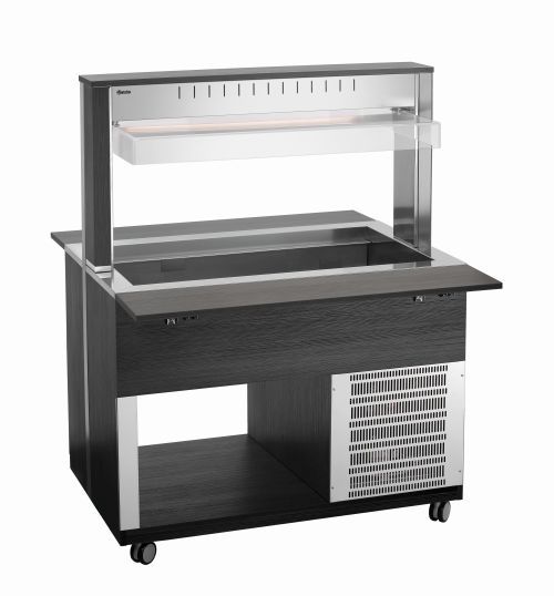 Die mobile Buffetlösung im modernen Holzdesign – Der Buffetwagen mit Hustenschutz und LED-Beleuchtung fasst 3 GN-Behälter 1/1 GN und hält Speisen zuverlässig am Buffet kalt.
