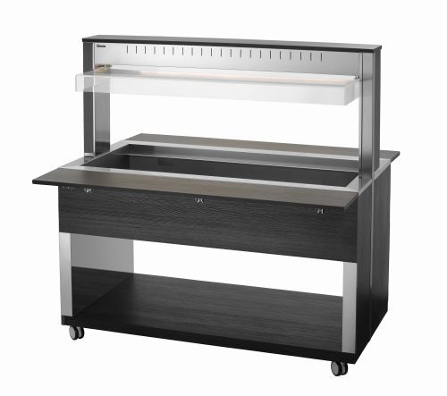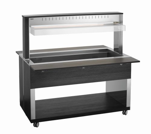 Die mobile Buffetlösung im modernen Holzdesign – Der Buffetwagen mit Hustenschutz und LED-Beleuchtung fasst 4 GN-Behälter 1/1 GN und hält mit dem Wasserbad-Prinzip Speisen schonend und ansprechend am Buffet warm.