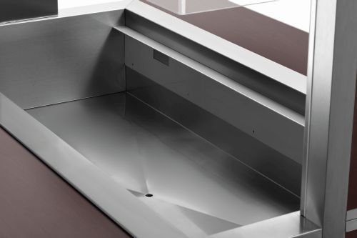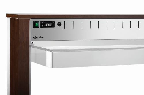 Die mobile Buffetlösung im modernen Holzdesign – Der Buffetwagen mit Hustenschutz und LED-Beleuchtung fasst 4 GN-Behälter 1/1 GN und hält mit dem Wasserbad-Prinzip Speisen schonend und ansprechend am Buffet warm.