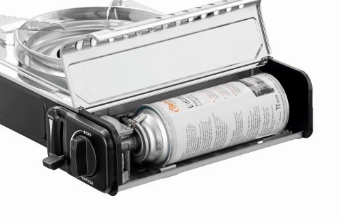 Klein, leicht, kompakt – Einfach praktisch. Dieser Gaskocher ist in Kombination mit den optional erhältlichen Gaskartuschen umgehend im Außenbereich einsatzbereit und ebenso schnell sowie platzsparend wieder verstaut.