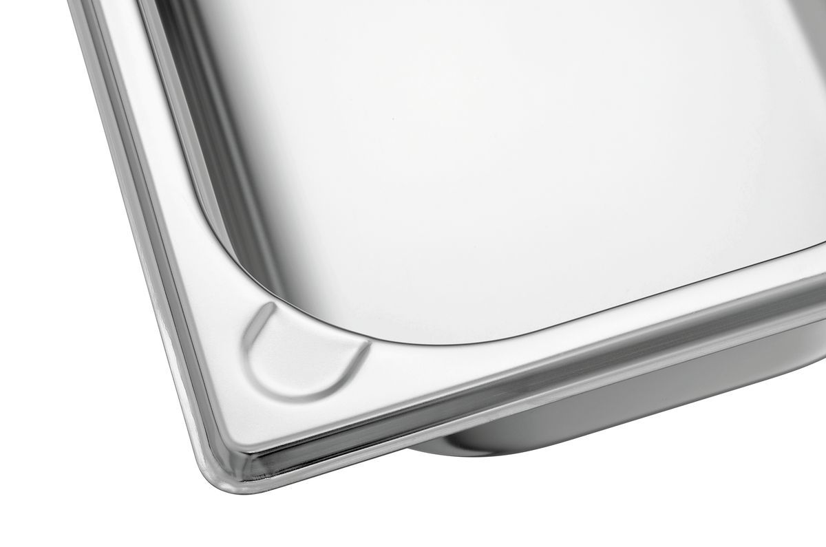 GN-Behälter nach EN 631 aus rostfreiem Chromnickelstahl mit seidenmatter Oberfläche.