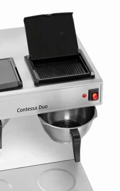 Die perfekte Kaffeemaschine für den Kaffeeausschank von Filterkaffee am Buffet, beim Catering oder auf Veranstaltungen. Mit der Contessa Duo lassen sich bis zu 13 Tassen je Kochstelle direkt in die Isolierkanne zubereiten. Die verbesserten Heizelemente aus Edelstahl bieten eine optimierte Wärmeübertragung.