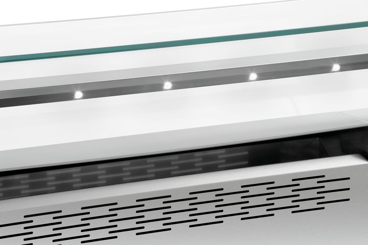 | Ablagefach unterhalb der Einstellnischen | Maße: B 1.200 x T 600 x H 150 mm 4 GN-Behältern 1/9 GN, 100 mm tief für Öle, Soßen, Kochbesteck integrierter Lüftung mit Labyrinth-Filter  |