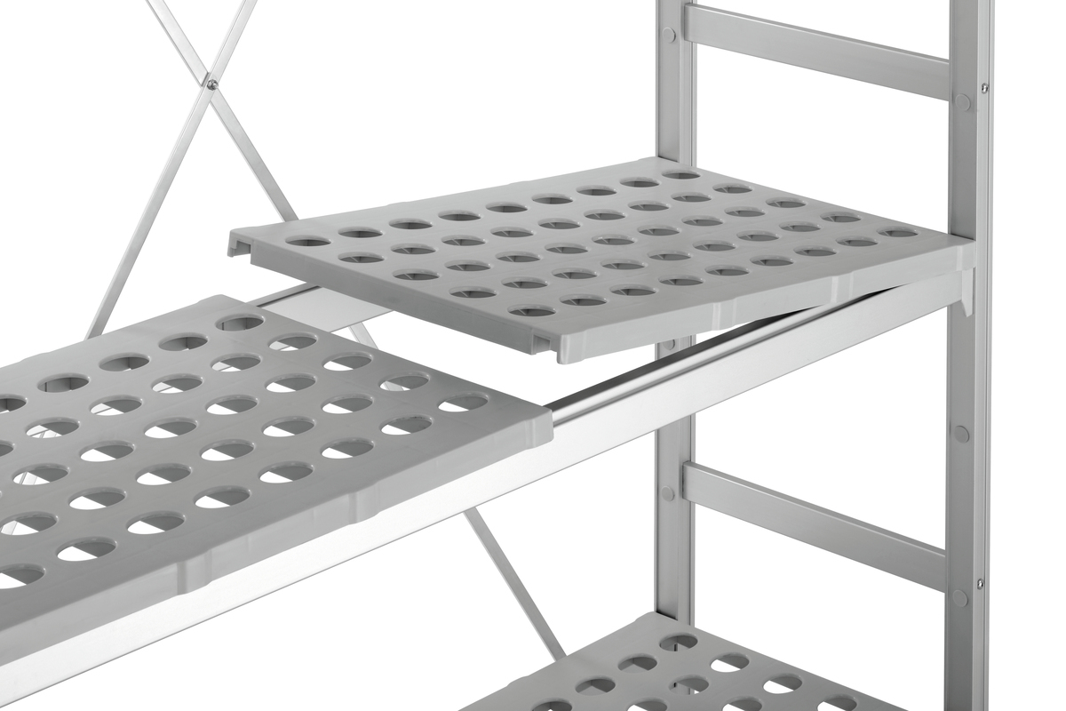 | praktischer Zweitnutzen durch den Einsatz von GN-Behältern anstatt Regalböden 2 Regale können zu einem Eckregal verbunden werden Regalböden spülmaschinengeeignet |