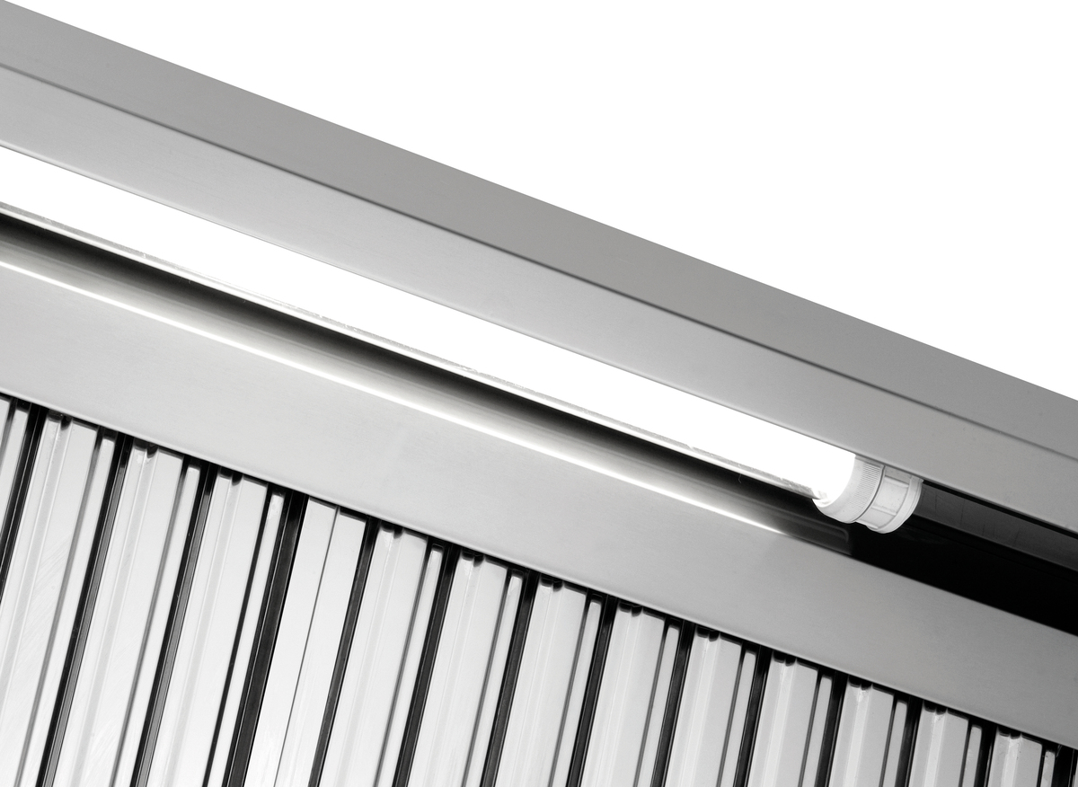 Mit gesetzlich vorgeschriebenen Flammschutzfiltern Typ A. Diese dienen dem Brandschutz, indem sie das Durchschlagen von Flammen in die Abzugshaube unterbinden und so die Feuergefahr deutlich senken.