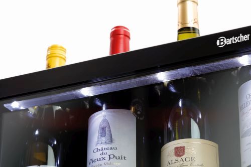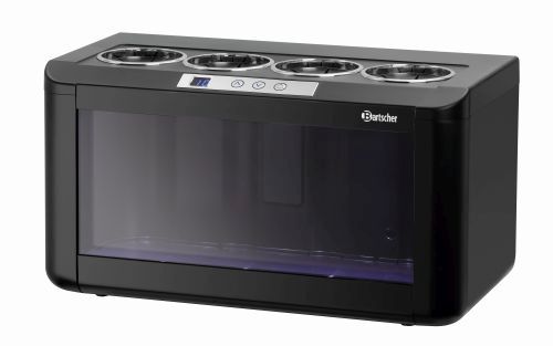 Platzsparender Weinkühler mit LED-Beleuchtung im eleganten Design. 4 Flaschen Weiß-, Rosé- oder Rotwein können innerhalb einer Temperaturzone im Offenausschank wie am Buffet, an der Bar oder beim Wein-Tasting repräsentativ kühl gehalten werden.