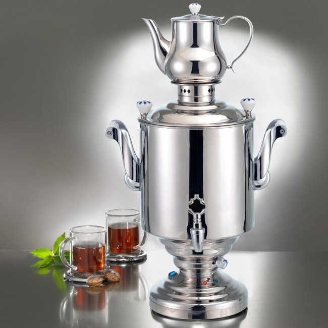 bildet optisch eine Brücke zwischen Tradition und moderne. In hochwertigem Edelstahl gefertig, fügt er sich in jede Teeküche und auf jedem Buffet ein. So steht Ihnen und Ihren Gästen und Kunden erstklassiger Tee oder einfach nur heißes Wasser jederzeit zur Verfügung. Die Bedienung und Reinigung des Samowars ist kinderleicht.