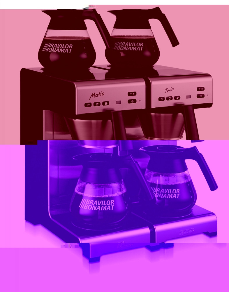 Matic Twin: 2 Schnellfiltergeräte für Orte mit Wasseranschluss. Geliefert mit 4 Kannen und 2 Edelstahlfilterpfannen. Modell mit 2 Brühsystemen und 4 Warmhalteplatten.