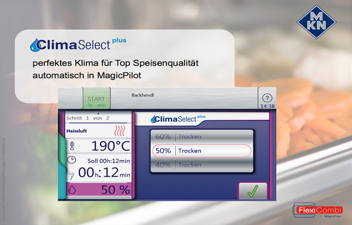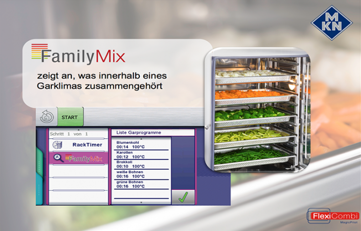 Produkte, die im gleichen Garraumklima gegart werden können, werden in einer übersichtlichen Liste vorgeschlagen. Effiziente Ausnutzung der Kapazität des Garraums.