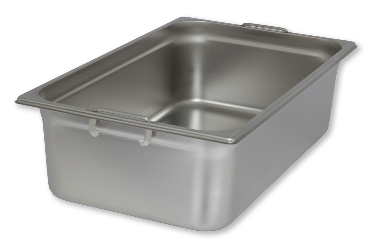 Gastronormbehälter 1/1 geschlossen aus Edelstahl mit versenkbaren Griffe. Mit diesen lassen sich die Behälter ohne Probleme beim Einschieben oder Herausziehen tragen. Die GN-Behälter sind ideal zum Lagern, Aufbewahren und Ausgeben von Lebensmitteln (wie z. B. Soßen, Suppen, Nudeln, Fleisch).